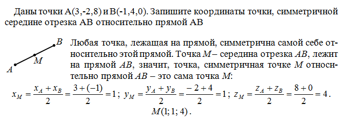 ПОМОГИТЕ!!!Даны точки A(3,-2,8) и В(-1,4,0). Запишите координаты точки, симметричной середине отрезка АВ относительно прямой АВ