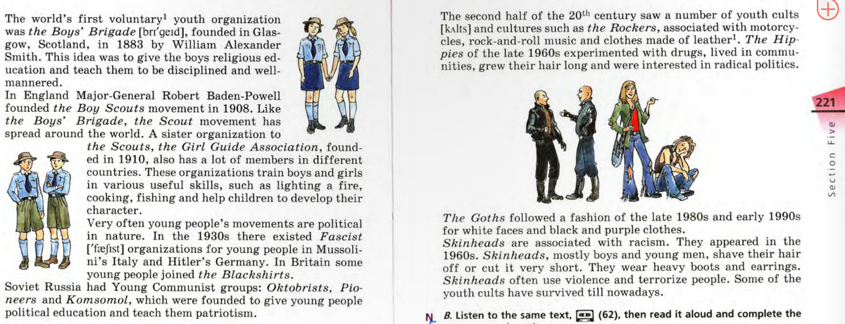Первый в мире добровольная молодежная организация была бригада мальчиков br'ged], основанный в Glas- Гоу, Шотландия, в 1883 году Уильямом А. Смита. Эта идея состояла в том, чтобы дать мальчикам религиозного ED- и научить Образовательная их быть дисциплинированным и хорошо воспитанным. В генерал-майор Англии Роберт Баден-Пауэлл основал движение бойскаутскую в 1908. Как бригады Мальчиков, скаутское движение распространилось по всему миру. Сестра организация скаутов, девушка Руководство Ассоциации, нашли ред в 1910 году, также имеет много членов в разных странах. Эти организации обучают мальчиков и девочек в различных полезных навыков, таких, как зажечь огонь, приготовление пищи, рыбная ловля и помогают детям развивать свой характер. Очень часто движения молодых людей носят политический характер. В 1930-е годы существовало фашистские [Feist] организации для молодых людей в Италии Mussoli- Ni и гитлеровской Германии. В Великобритании некоторые молодые люди присоединились к чернорубашечников. Советская Россия была комсомолка группы: Oktobrists. Пионерские neers и комсомол, которые были основаны, чтобы дать молодым людям политическое образование и научить их патриотизм.
