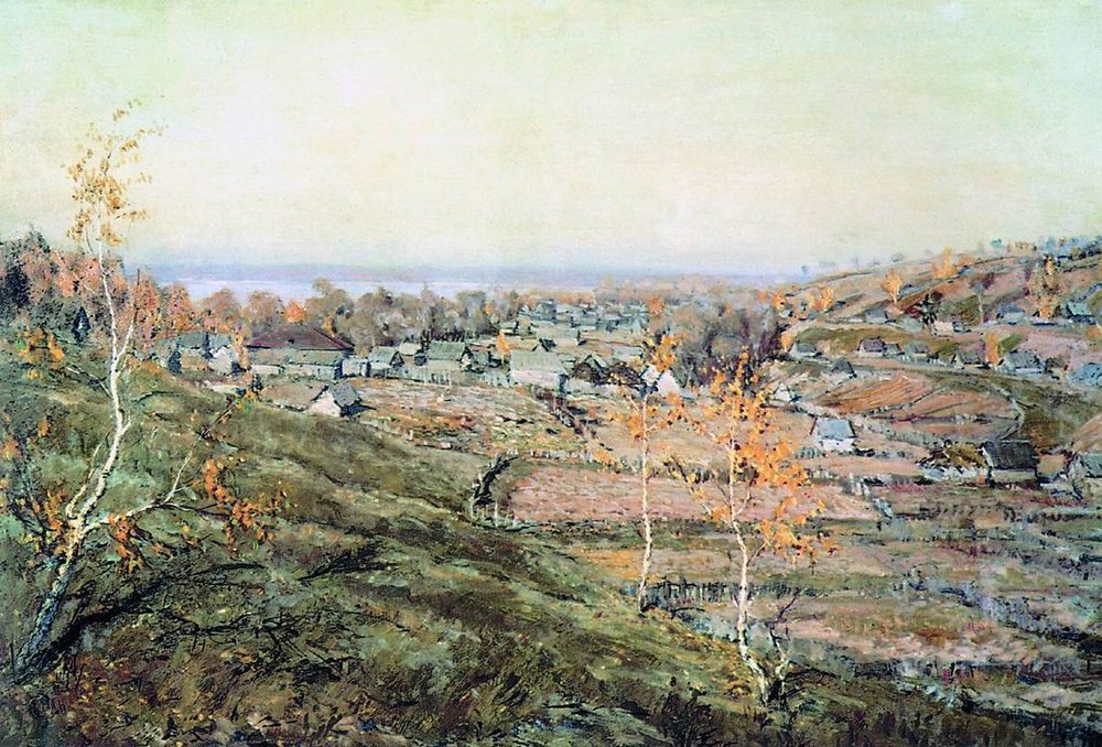 Это было когда-то. Мама решила со мной пойти в Третьяковскую галерею. Натюрморты, пейзажи, портреты великих и неизвестных. Мы долго ходили по залам музея... Неожиданно мое внимание привлекло скромное полотно. Оно называлось " Село Хмелевка". На картине изображена осень. Художник изобразил ее " сверху", ибо пейзаж размыт, а краски неяркие.