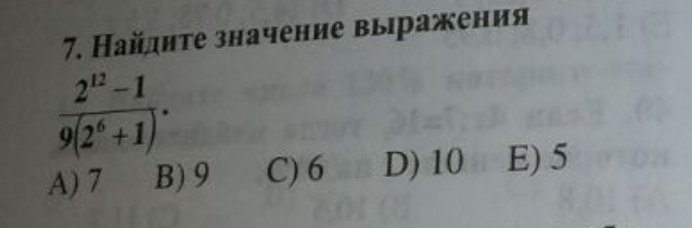 (2^12-1)/9(2^6+1)=числитель разложим по формуле разности квадратов=(2^6-1)(2^6+1)/9(2^6+1)=(2^6-1)/9=числитель снова разложим по ф-ле разности квадратов=(2^3-1)(2^3+1)/9=7•9/9=7