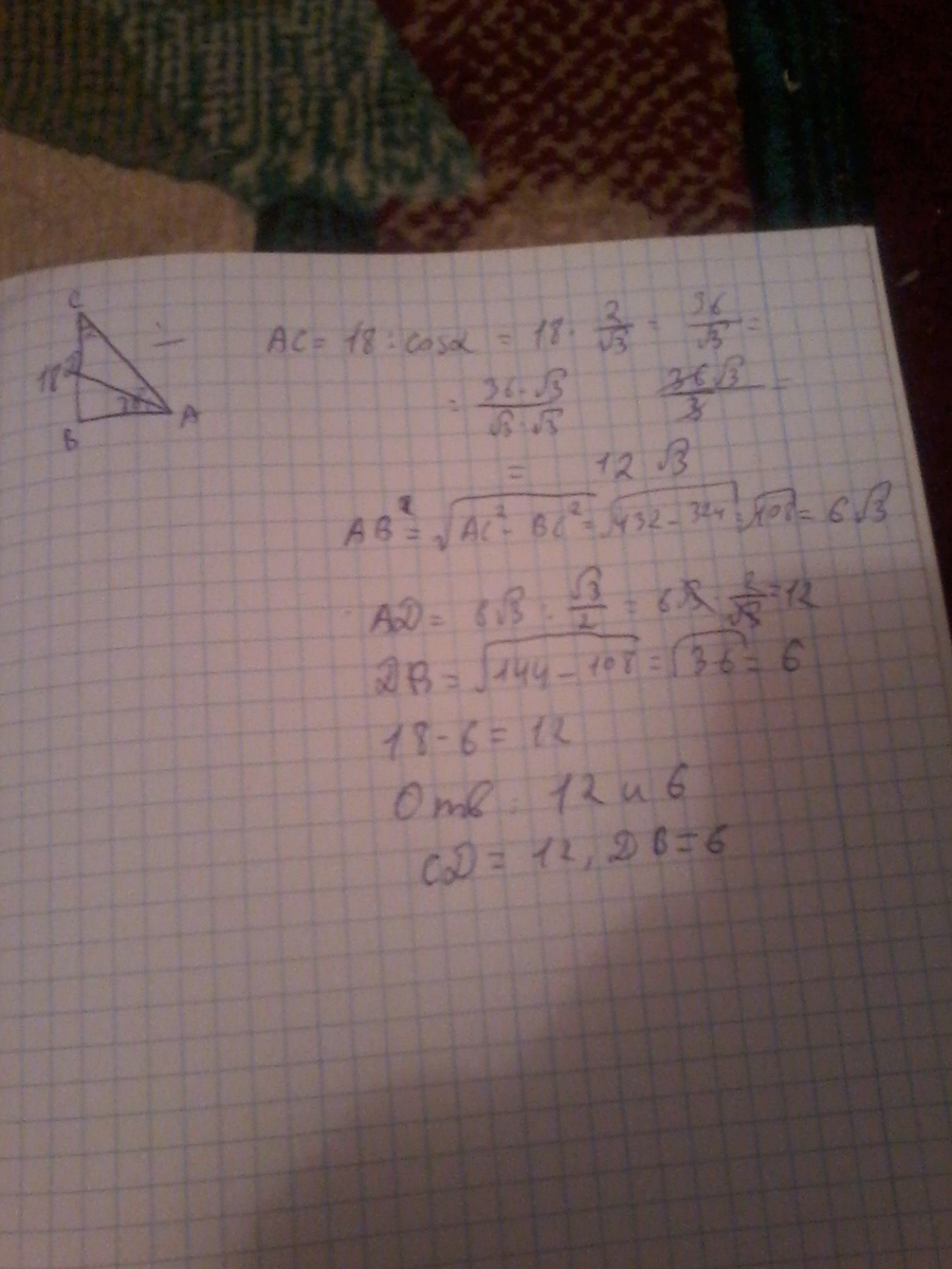в прямоугольном треугольнике а б ц угол B равен 90 градусов угол C равен 30 градусов BC равно 18 сантиметров Найдите длины отрезков на которые биссектриса AD делит катет BC