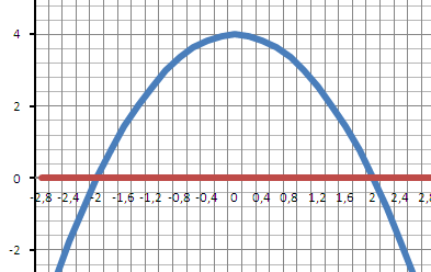 Площадь параболы в пределах от Х1=+2 до Х2 = -2 - корни квадратного уравнения
