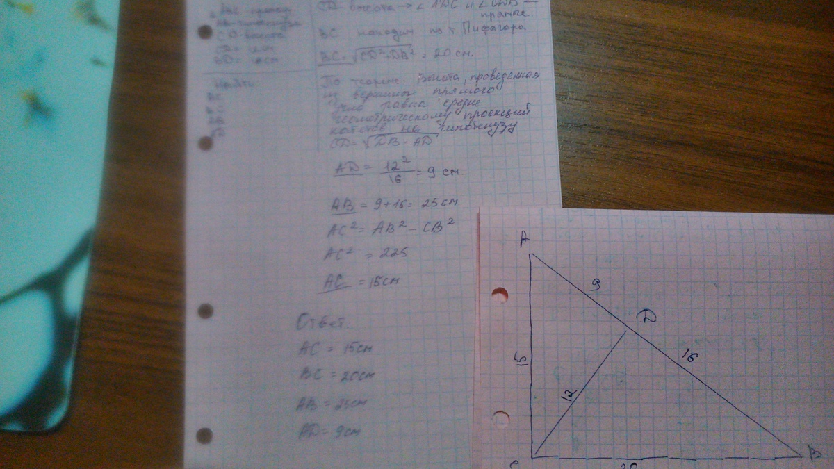 В прямоугольном треугольнике ABC с гипотенузой АВ. Высота CD=12см,BD=16 см. Найти AC,ВС,АВ,АD