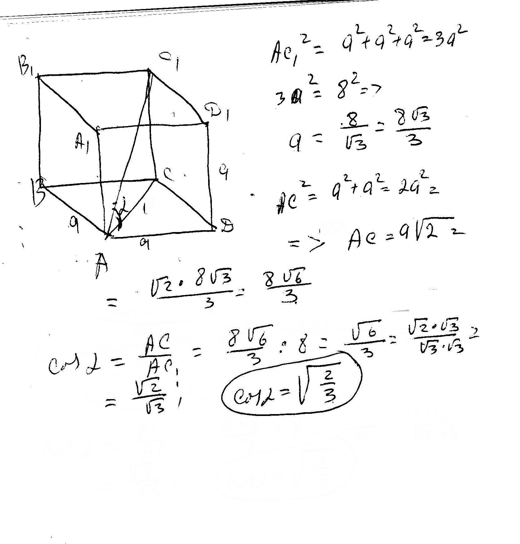 диагональ куба равна 8 см. найти а)ребро куба б)косинус угла между диагональю куба и плоскостью основания