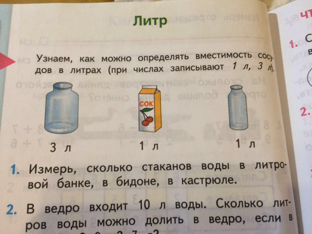 1 стакан это 200 мл а 1 литр 1000 мл значит в трех литровой банке 1000:200=5стаканов и так даллее