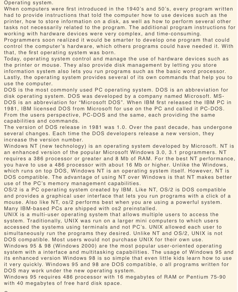 10.The special features of Windows 95, Windows 98, Windows 2000 are the following: they all have the most popular user oriented system with an interface and multitasking capabilities, they are DOS compatible. Windows 95 requires 486 processor with 16 megabytes of RAM or Pentium 75-90 with 40 megabytes of free hard disk space.