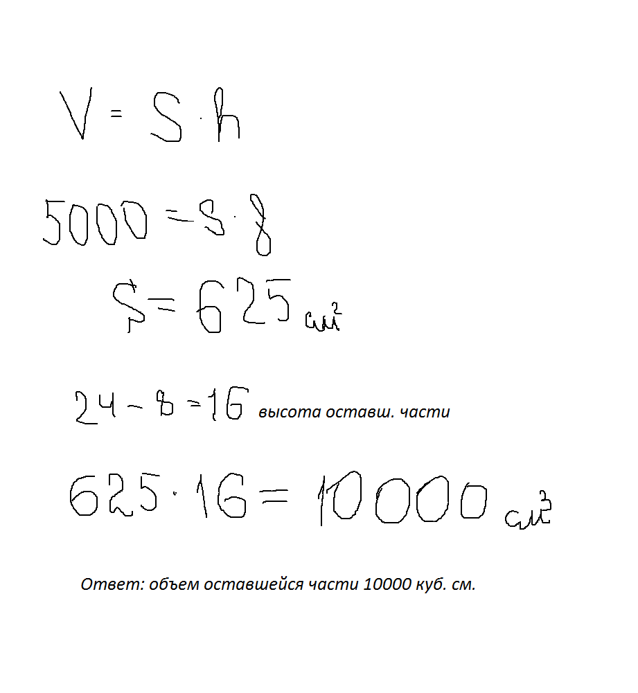 в цилиндр высотой 24 см налили жидкость обьемом 5000см3 до уровня 8см. чему равен обьем(см3) оставшейся части цилиндра?