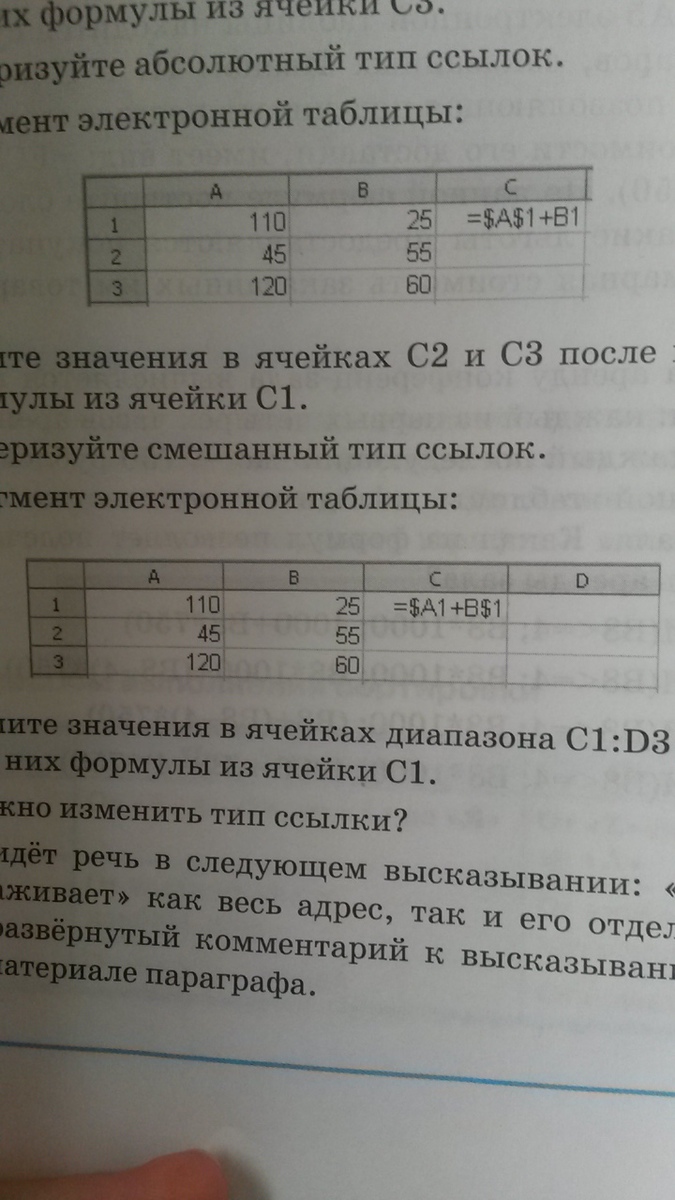 Таким образом при копировании формулы =$A1+B$1 из ячейки С1 в ячейки С2 и С3 (в пределах столбика С), будет меняться номер ячейки А.
