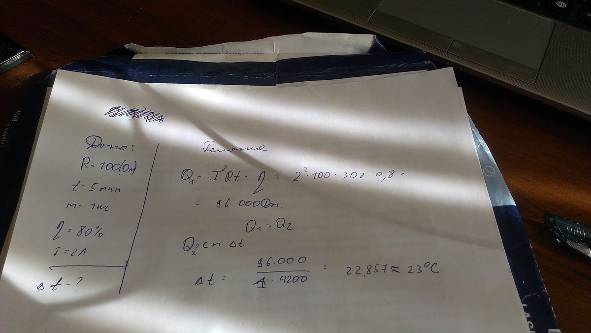 Через электрический кипятильник с сопротивлением 100 Ом в течении 5 мин течет электрический ток. На сколько градусов нагреется 1 кг воды этим кипятильником,если его КПД 80%, а сила тока 2 А