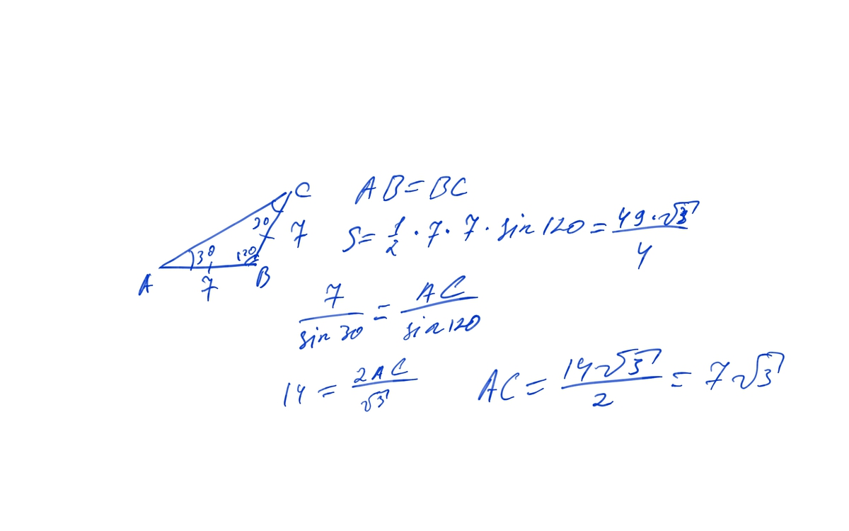 АС/sin120° = АВ/sin30°. AС/sin120° =7/ sin30. 2АС/√3 = 14. АС =7√3cm