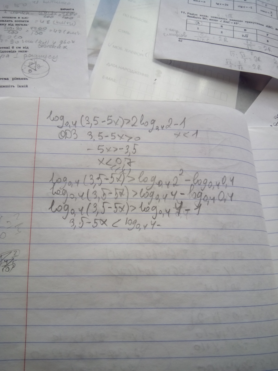 log по оcнованию 0,4 в скобках (3,5-5х)>2log по основанию 0,4 -1