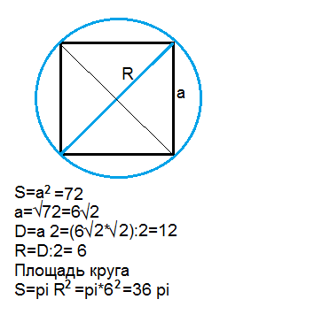 Найти площадь круга, если площадь вписанного в ограничивающую его окружность квадрата равна 72 кв. дм.