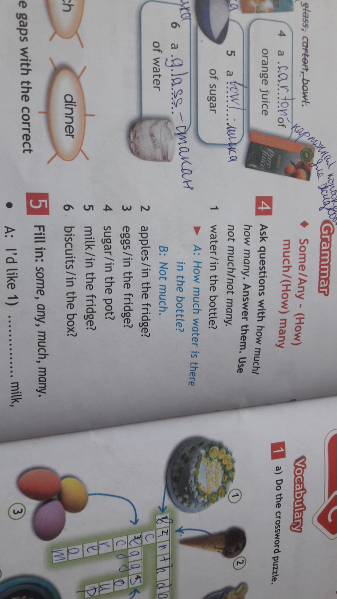 Номер 4. 2. How many apples are there in the fridge?—Not many. 3. How many eggs are there in the fridge?—Not many. 4. How much sugar is there in the pot?—Not much. 5. How much milk is there in the fridge?—Not much. 6. How many biscuits are there in the box?—Not many.