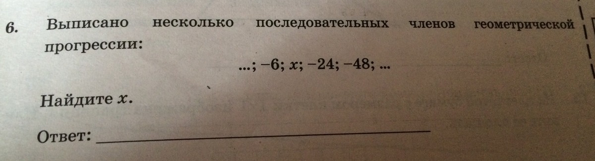 Смотри. Геометрическая последовательность , это такая последовательность, где каждый следующий член больше во сколько-то раз предыдущего. Мы видим: ... -6...X...-24...-48. У нас есть 2 известных члена. Для нахождения коэффициента прогрессии. Делим член на предыдущий член. Делим -48 на -24. Получаем 2. Следовательно -6 умножаем на 2 и получаем -12. X=-12