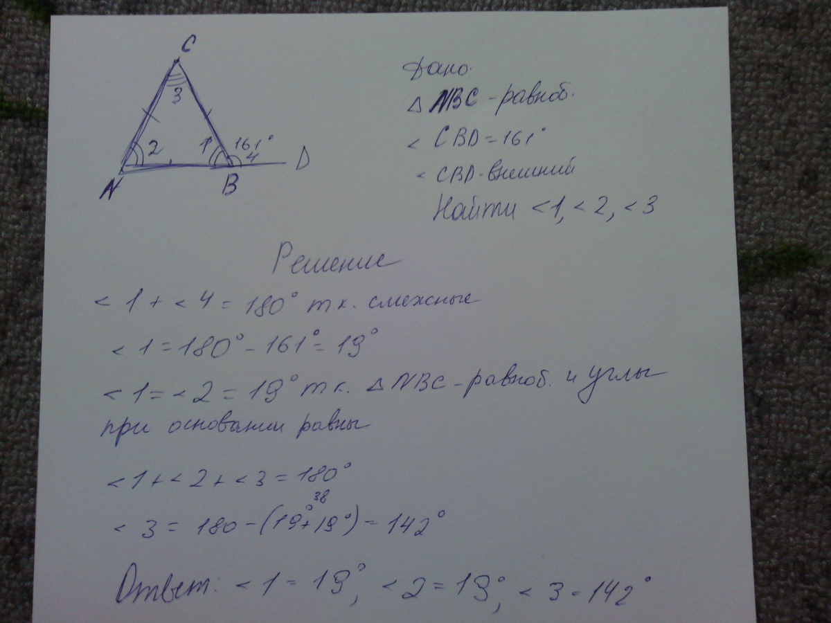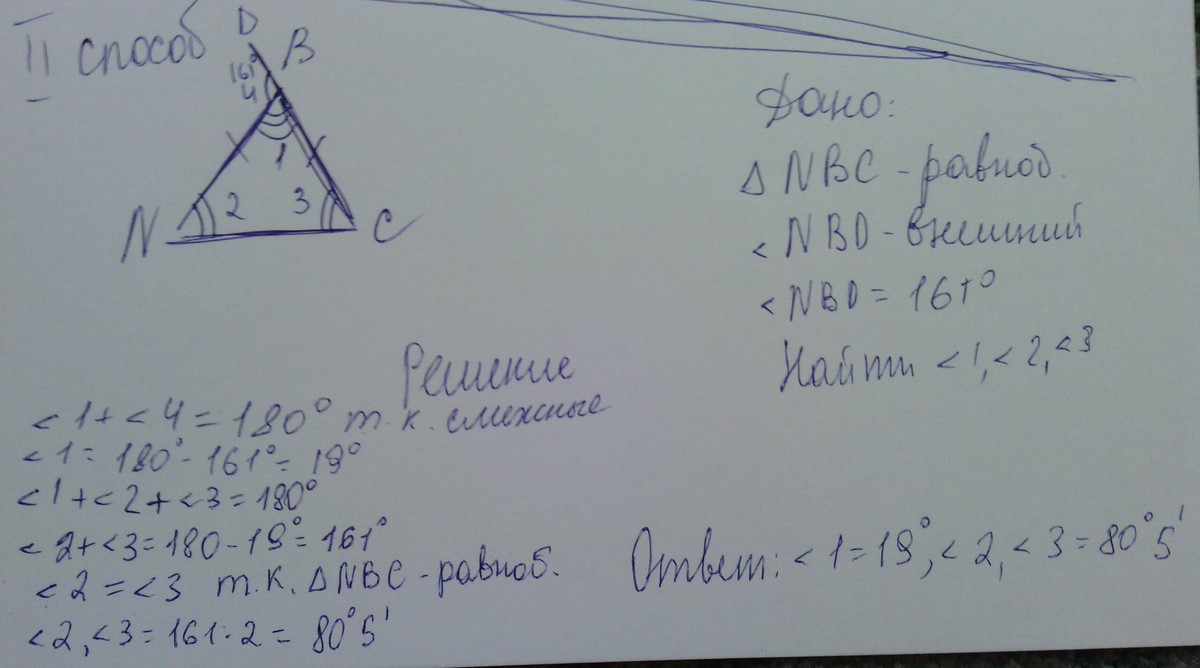 Определи величины углов равнобедренного треугольника NBC , если внешний угол угла вершины B равен 161°.