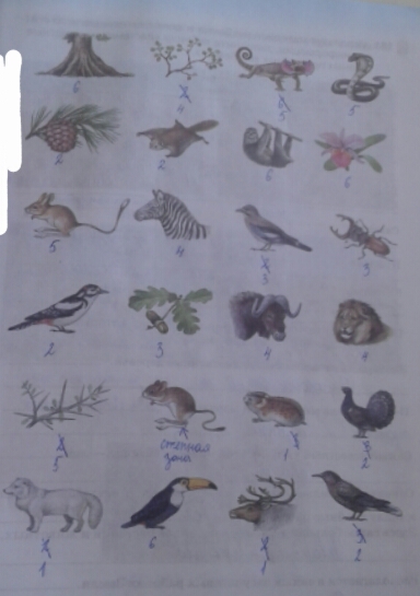 Проверьте, пожалуйста. Рассмотрите рисунок. Определите, в каких природных зонах обитают эти растения и животные . Укажите цифрами.
