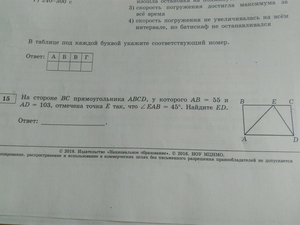 На стороне BC прямоугольника ABCD, у которого АВ =55 и AD=103, отмечена точка Е так, что угол ЕАВ=45. Найдите ЕD.
