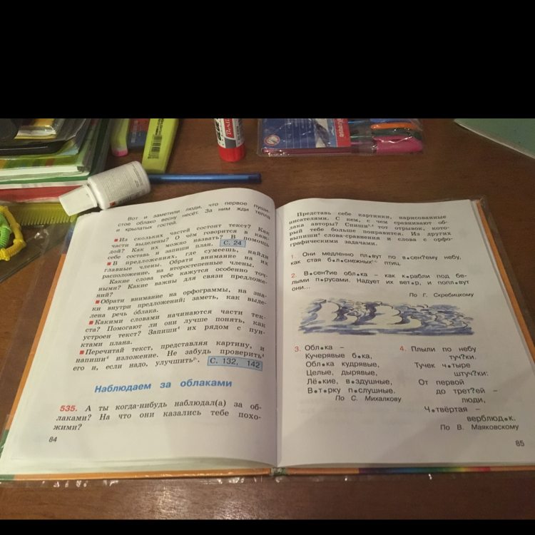 А ты когда-нибудь наблюдал(а) за облаками? На что они казались тебе похожими? Представь себе картинки, нарисованные писателями. С кем, с чем сравнивают облака авторы? Спиши тот отрывок, который тебе больше понравится. Из других выпиши слова-сравнения и слова с орфографическими задачами. Упражнение 535