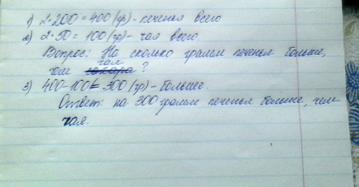 девочка купила 2 пачки печенья по 200 грамм в каждом и 2 пачки чая по 50 грамм каждая Поставь вопрос и реши задачу