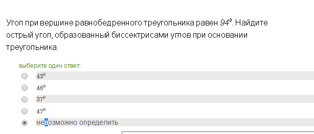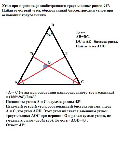 Углы при основании равнобедренного треугольника <A=<C =(180°-94°)/2=43°.