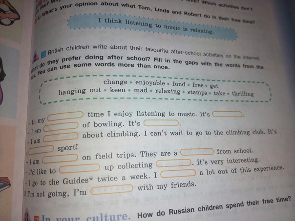 Мне нравится боулинг. Это весело. Я с ума схожу по скалолазанью. Мне не терпится пойти в клуб скалолазанья. Это захватывающий спорт! Мне нравятся экскурсии. Это разнообразие от занятий в школе. Я хочу начать коллекционировать марки. Это очень интересно. Я хожу на занятия для гидов два раза в неделю. Я много получаю от этого опыта. Если я не иду туда, то я иду гулять со своими друзьями.