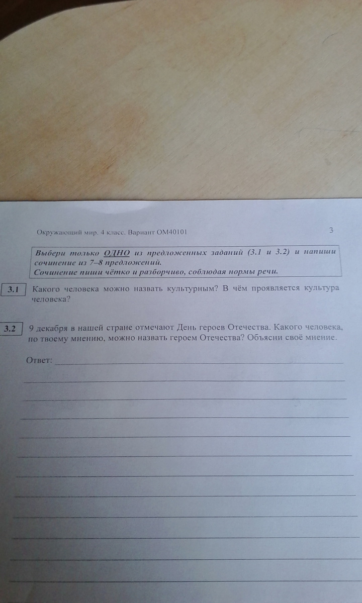 3.1 Культурного человека можно назвать того кто соблюдает этикет, ни в коем случае не ругается матом или оскорблениями. Он редко обижает людей а если и случится то это из-за лени или обиды. Культурный человек не заставит вас ждать, будет работать быстрее но и сделает все без обид. Как то так :D 3.2. Я сничаю что самым настоящим героем можно называть своих дедушек, бабушек сражавшимся на войне. Они (некоторые) отдали свою жизнь, некоторые вижили и защищали не только свою семью но и целую родину! Они очень смелые и они могут точнее должны носить звание героя!