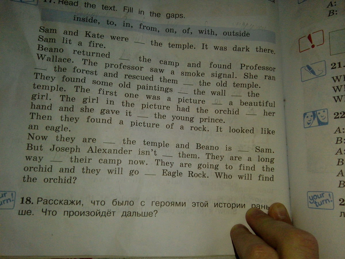 Сэм энд Кэти вё ин зэ тэмпл. Ит вос дак зэрэ. Сэм лит э файр. Бино ретёрнд ... зэ кэмп фаунд профессор ... зэ форэст энд рескьюд зэм .. зэ олд темпл. Зэй фаунд сам олд пэинтингс .. зэ волл..зэ гёрл. Зэ гурл ин зэ пикчэ хэд зэ орчайд .. хё хэнд энд ши гэв ит.. зэ янг принс. Зэн зэй фаунд э пикчэ оф э рок. Ит локд лайк эн игл. Нфу зэй а .. зэ тэмпл энд Бино ис .. Сэм. Бат Жёзэп Александр иснт ... зэм. Зэй а э лонг вэй.. зэй кэмп нау. Зэй а гоунг ту фаинд зэ орчайд энд зэй вилл гоу.. игл рок. Ху вилл файнд зэ орчайд?