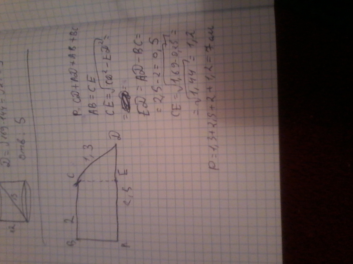 основания прямоугольной трапеции равны 2,0 и 2,5 .большая боковая сторона равна 1.3см,найдите периметр трапеции