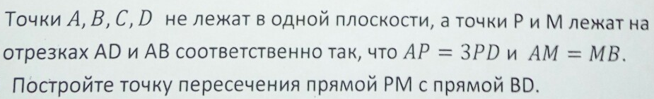A , B, D и C не лежат в одной плоскости. Точка C ∉ плоскости α [ α это плоскость (ABD)], поэтому CD ∉ α и пересекает эту плоскость в точке D которая не лежит на прямой PM.