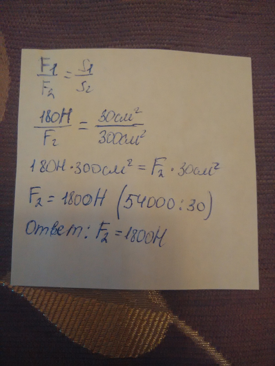 на меньший поршень гидравлического пресса площадью 30см2 действует сила 180h. Площадь большего поршня 300см2 .какая сила действует на большой поршень ?