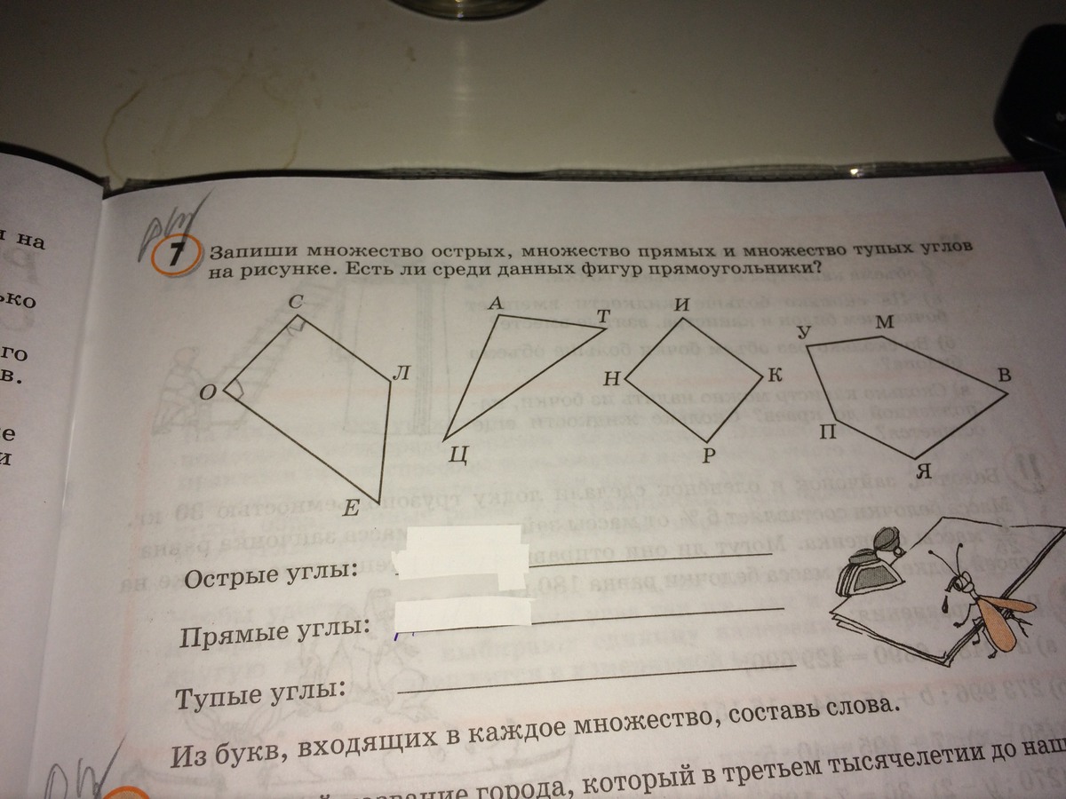 Запиши множества острых, множество прямых и множество тупых углов на рисунке. Есть ли среди данных фигур прямоугольники?