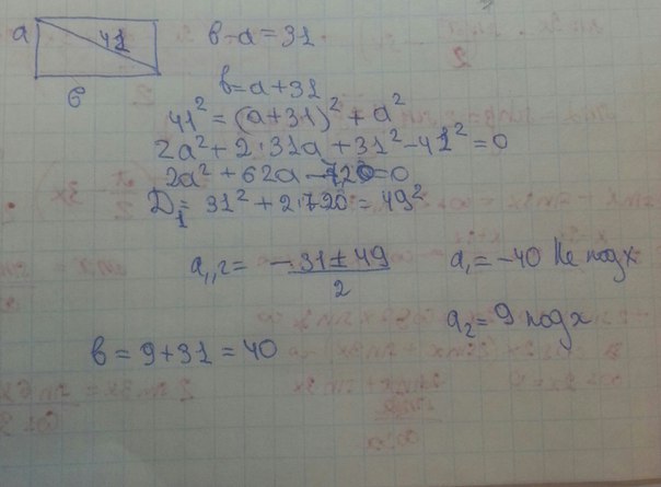 найти стороны прямоугольника, если их разность равна 31 см, а диагональ прямоугольника равна 41 см