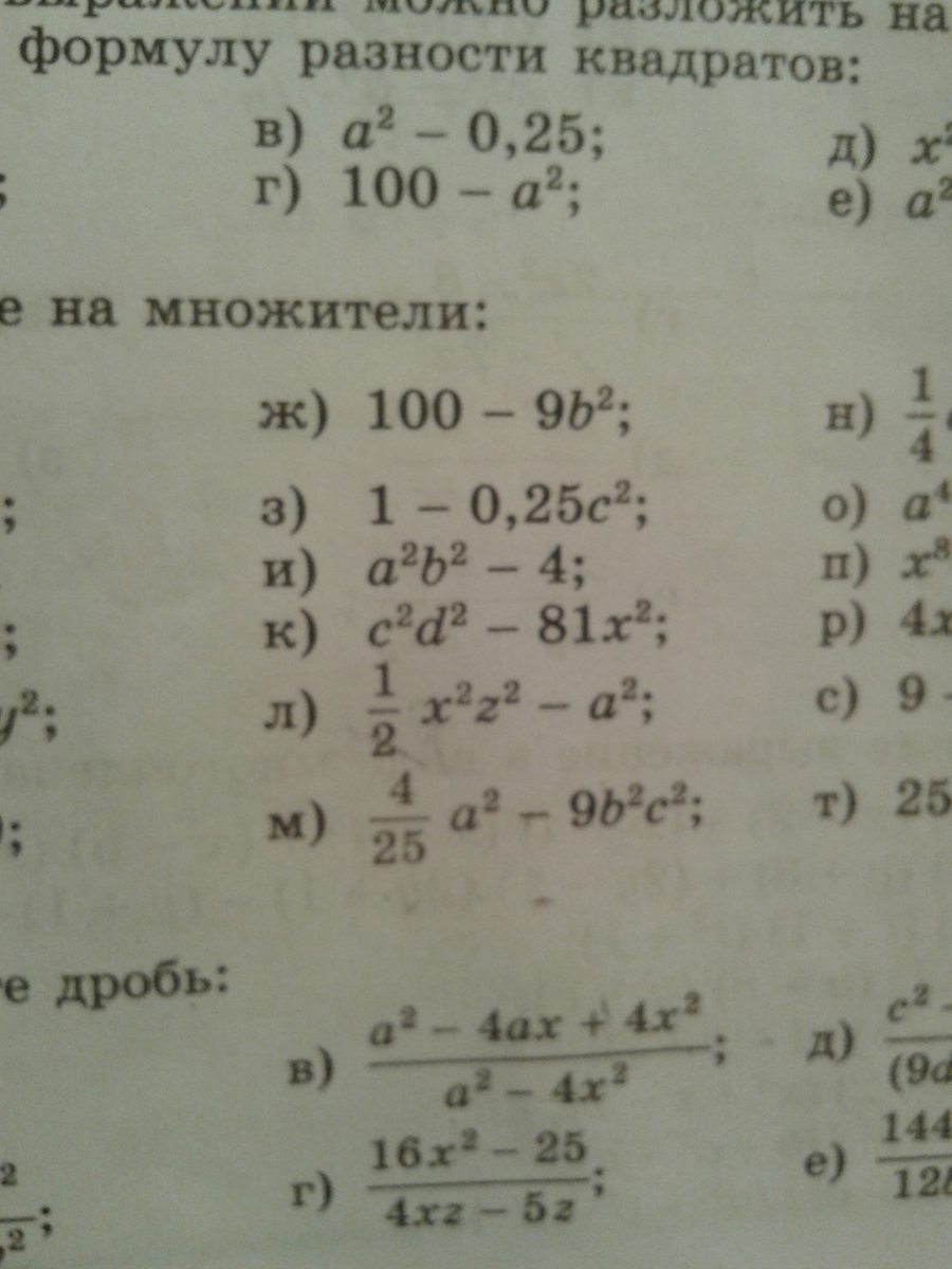 ж)=(10-3b)(10+3b); з)=(1-0,5с)(1+0,5с); и)=(ав-2)(ав+2); к)=(сd-9x)(cd+9x); л)=1/2(xz-a)(xz+a); м)=(2/5а-3bc)(2/5+3bc)