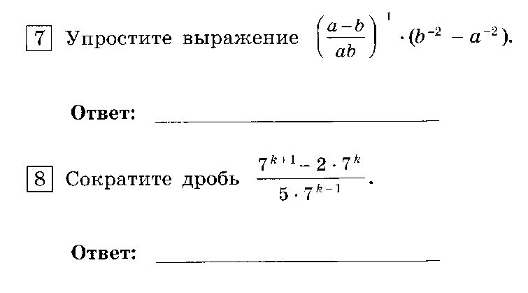 7)1/b^2-1/a^2=(a^2-b^2)/a^2b^2, ab/(a-b )*(a-b)(a+b)/a^2b^2=(a+b)/ab. 8) (7^(k+1)-2*7^k)/5*7^(k-1)=7^k(7-2)/(5*7^(k-1))=7^(k-1)*7/7^(k-1)=7.