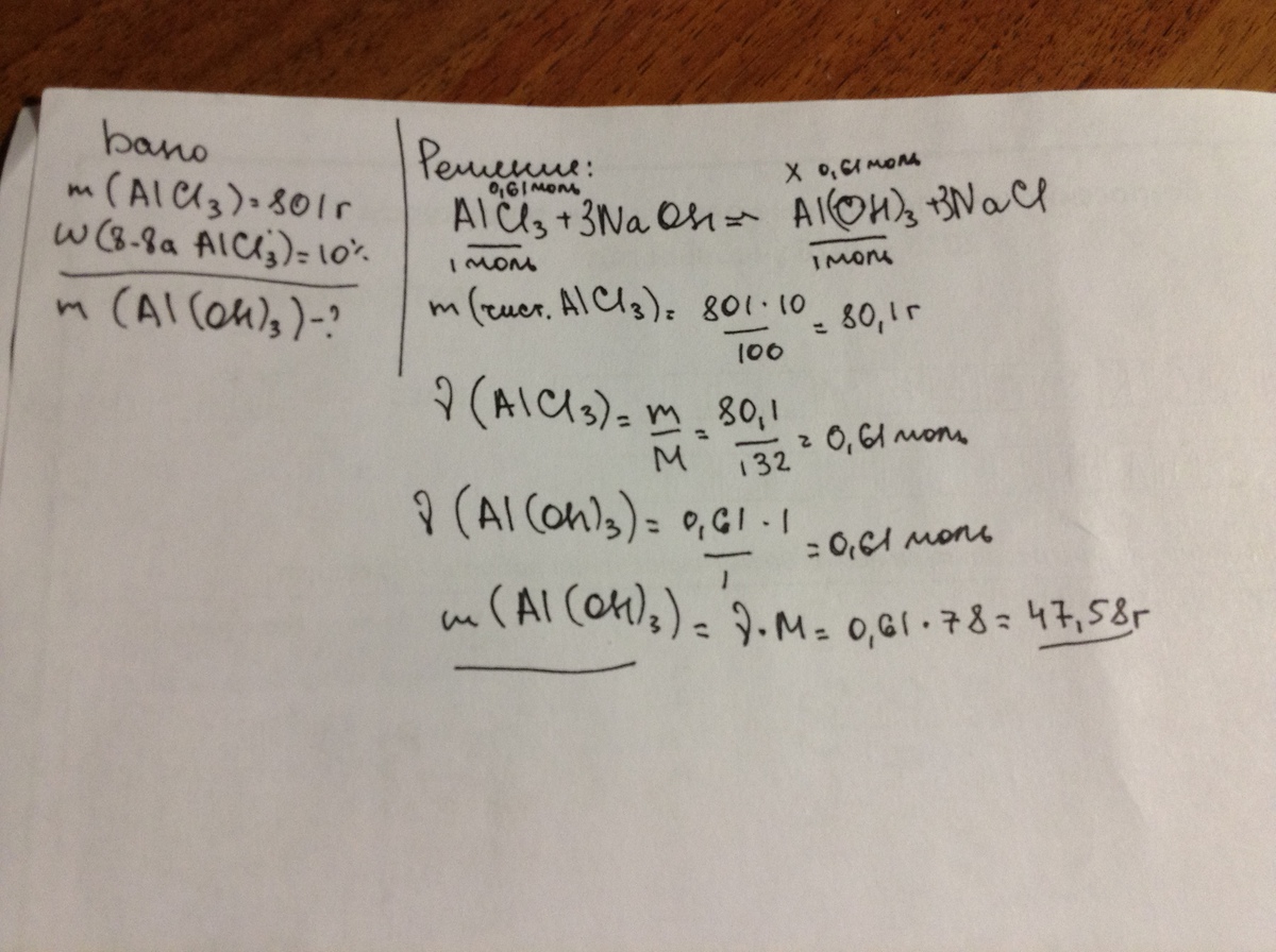 какая масса гидроксида аллюминия образуется при взаимодействии 801г раствора хлорида аллюминия с массовой долей 10% и избытке раствора гидроксида натрия?