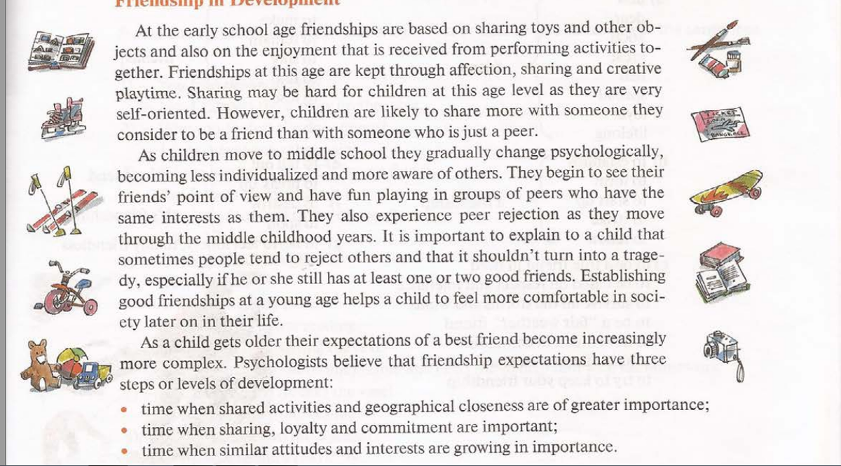 в раннем школьном возрасте дружба основана на совместных играх и других объектах, а так же на удовольствие, которое принимается от осуществления деятельности сжаться вместе. дружба в этом возрасте держится за счет привязанности, совместной деятельности и творческой перемене. совместное использование может быть трудно для детей в этом возрасте, поскольку они являются очень автономно ориентированными. тем не менее дети могут делиться с кем-то кого они считают другом, чем с тем, кого они считают просто сверстником. когда дети переходят в среднюю школу, они постепенно меняют психологию, становятся менее индивидуализированы и более осведомлены от других. они начинают видеть точку зрения своих друзей и получать удовольствие от игры в группах со сверстниками, имеющих одни и те же интересы, как и у них. они так же испытывают неприятие со стороны сверстников, как они перемещаются по центру детских лет. важно объяснить ребенку что иногда люди склонны отвергать других и что это не должно превращаться в трагедию, особенно если он или она по прежнему имеет одного или двух друзей. установление хороших дружеских отношений в молодом возрасте помогает ребенку чувствовать себя более комфортно в обществе, позже в жизни. когда ребенок становится старше их ожидания лучшего друга становятся все более сложными. психологи считают, что ожидание дружбы есть три шага или уровня развития когда время совместной деятельности и географическая близость имеют большее значение, время, когда совместное использование лояльность и поврежденность имеют важное время отношения и интересы растут в важности