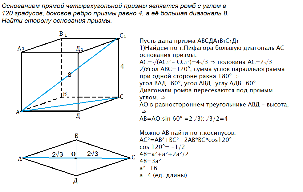 Основанием прямой четырехугольной призмы является ромб с углом в 120 градусов, боковое ребро призмы равно 4, а её большая диагональ 8. Найти сторону