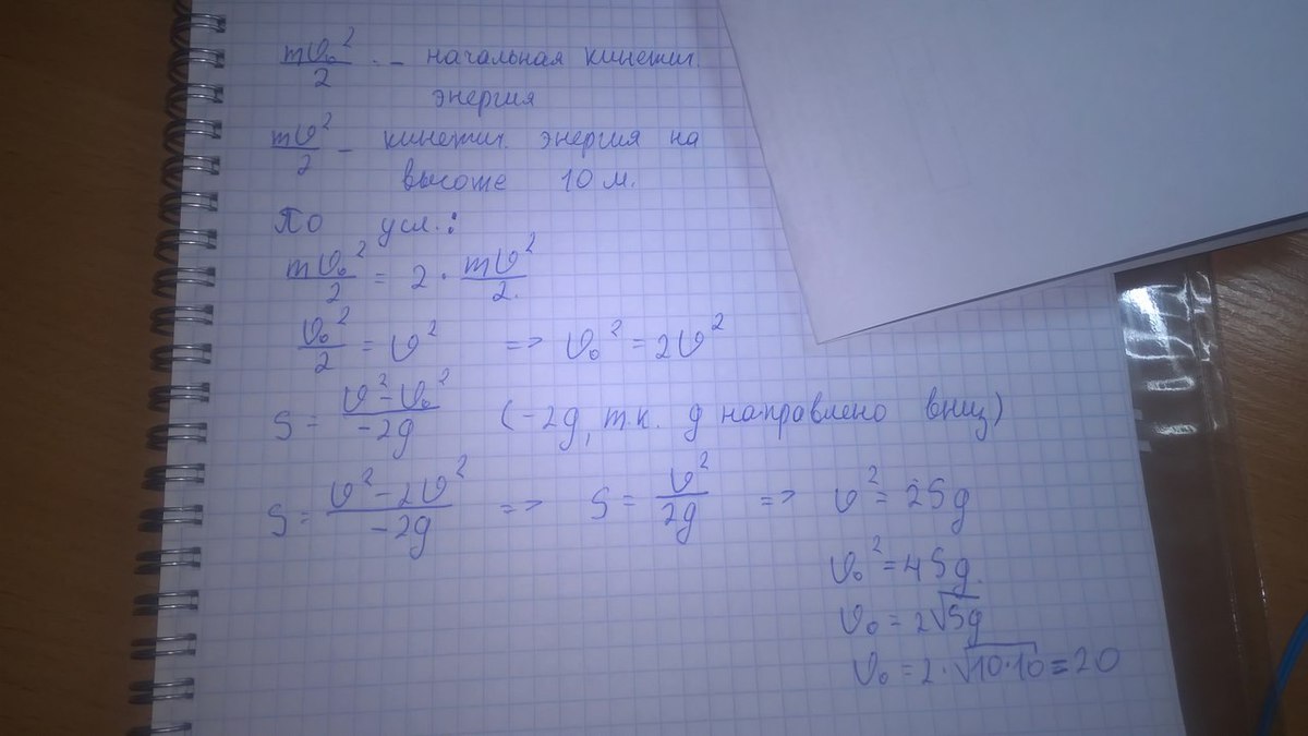з якою початковою швидкістю було кинуто вертикально вгору тіло, якщо на висоті 10 м його кінетична енергія вдвічі менша від початкової?опір повітря не враховуйте, вважайте що g=10 м/c^2