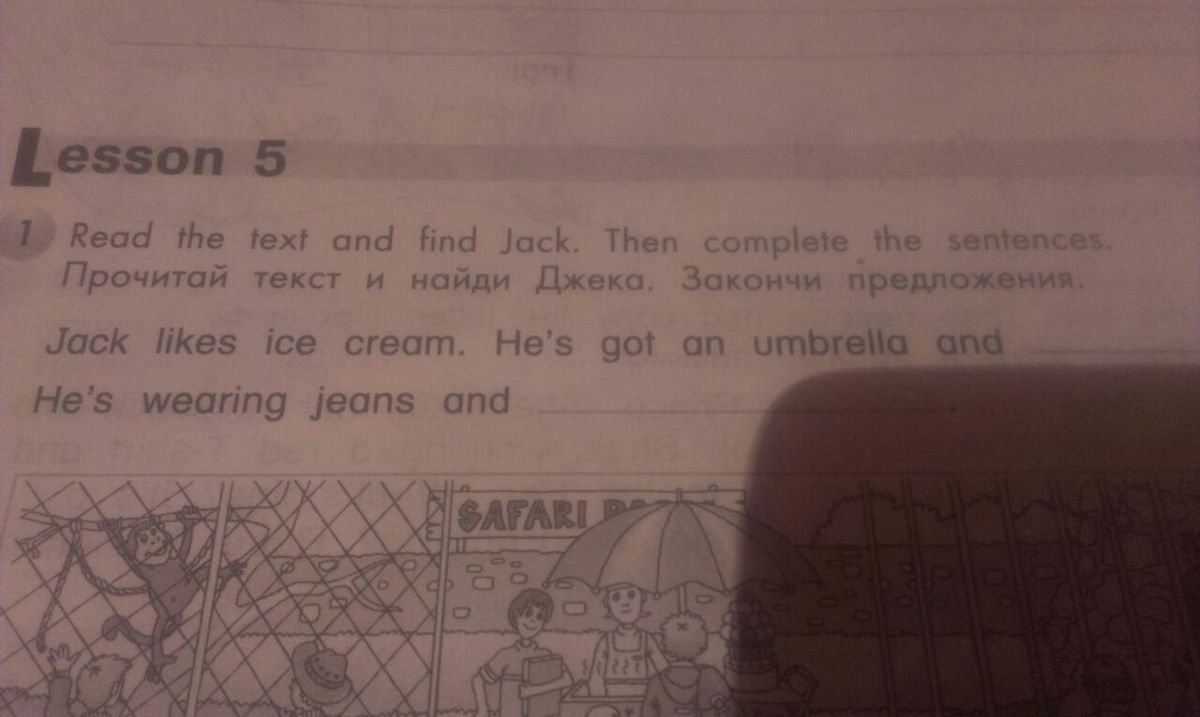 Закончи предложения. Jack likes ice cream. He's got an umbrella and....... . He's wearing jeans and...... .