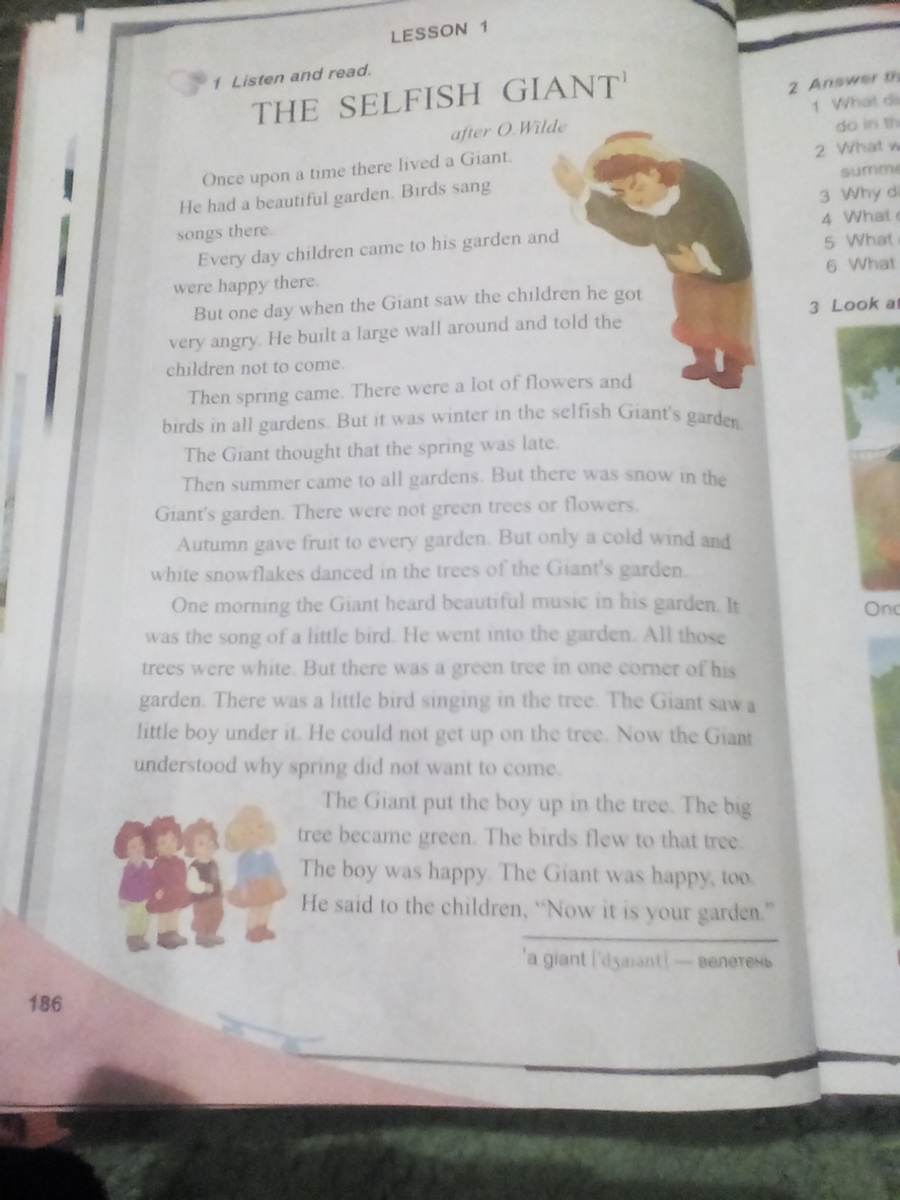 Однажды жил великан.У него был красивый сад.Птицы пели песни там.Каждый день туда приходили дети и были счастливы.Но когда великан увидел детей ,он разозлился.Построил огромную стену и велел детям не подходить.