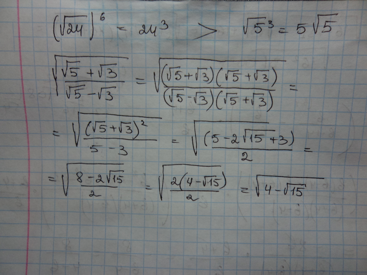 что больше 6 степень корня из 24 или 3 степень корня из 5? 2)освободитесь от рациональности в дроби корень из суммы корня из 5 и корня из 3/корень из разности корня из 5 и корня из 3