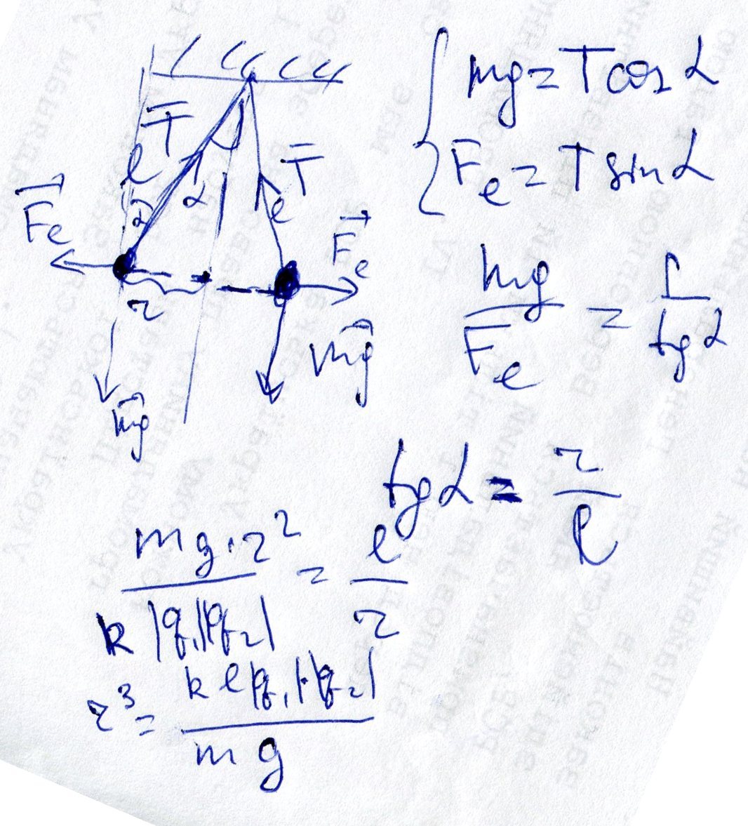 Трішки малюнок замазаний - чорновик. Але, ніби, суть така. Однойменні заряди відштовхуються. Використовуючи умову рівноваги тіла, записуєм два рівняння, розв'язуєм відносно r. Тільки я помилку допустила: в передостанній формулі буде множник 4 перед mgr^2, і відповідно 4 у знаменнику для останньої рівності. Але для рішення задачі необхідні ще дані, наприклад, де причіплені кульки (в одній точці, як я зобразила, чи де-інде), масу кульок (кульки), їх заряди? Зрештою, як просила, що небудь.))