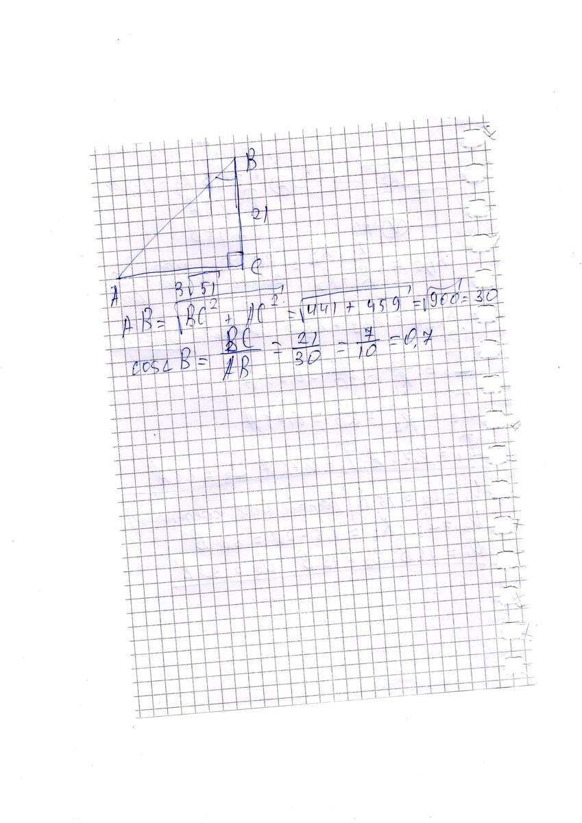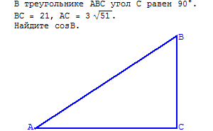 в треугольнике авс угол с равен 90 вс равен 21 ас равен 3 корень 51 найдите косинус в