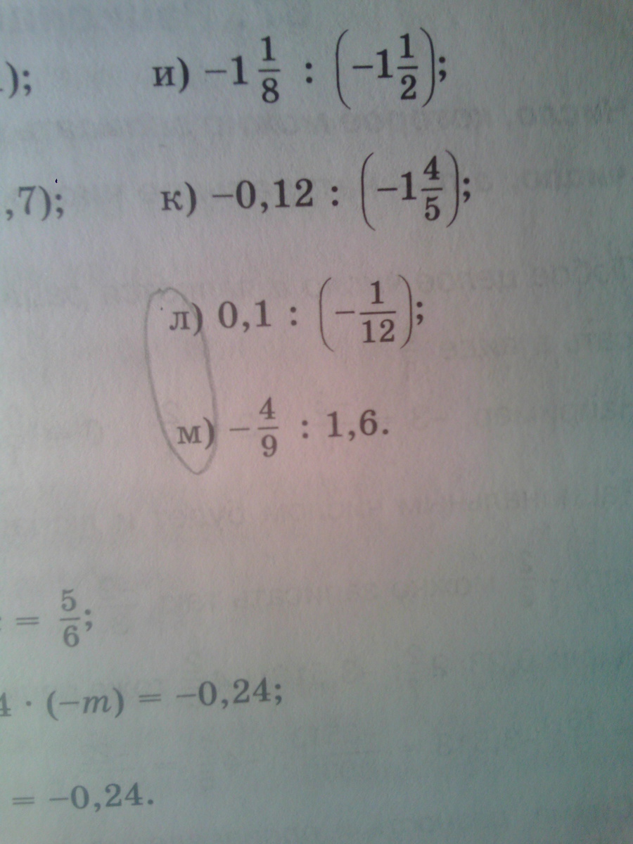 л) 1/10 : (-1/12) = 1/10 * (- 12) = - 1,2 или -1 целая 1/5