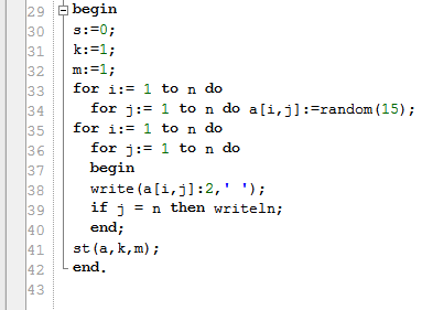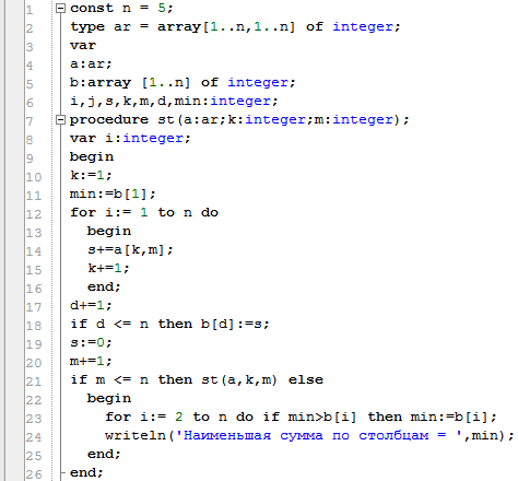 Было скучно и я решил замарочиться:DТут и процедура и рекурсия:)Основной блок программы на второй картинке. Const n - размерность матрицы.Понятно дело,что можно намного проще и без рекурсии,но мне интересно было сделать с ней.Не разумно в данном случае.Вы так не делайте:D