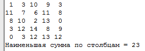 напишите программу, которая выводит на экран столбец матрицы, сумма значений элементов которого наименьшая