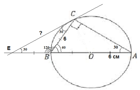 Угол между диаметром АВ и хордой АС равен 30*. Через точку С проведена касательная, пересекающая прямую АВ в точке Е.Найдите СЕ, если радиус окружности 6см. Решение.