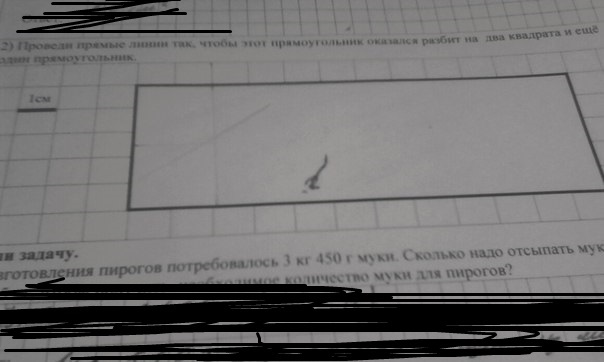 Проведи прямые линни так чтобы этот прямоугольник оказался разбит на два квадрата и еще один прямоугольник