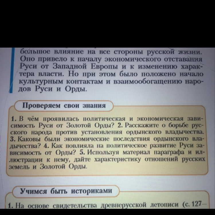 1. Русь платила дань Орде, Русь не могла иметь большое войско, и была уязвима для других врагов.2. В 1380 году войска под руководством Дмитрия Донского разгромили хана Мамая на Куликовском поле, так начался этап освобождения Руси от монголо-татарского ига.3. Русь была истощена. 4. Зависимость от Орды затормозила развитие Руси во всех направлениях. 5. Война, постоянные набеги со стороны монголов, иго Орды.