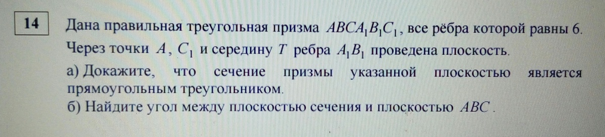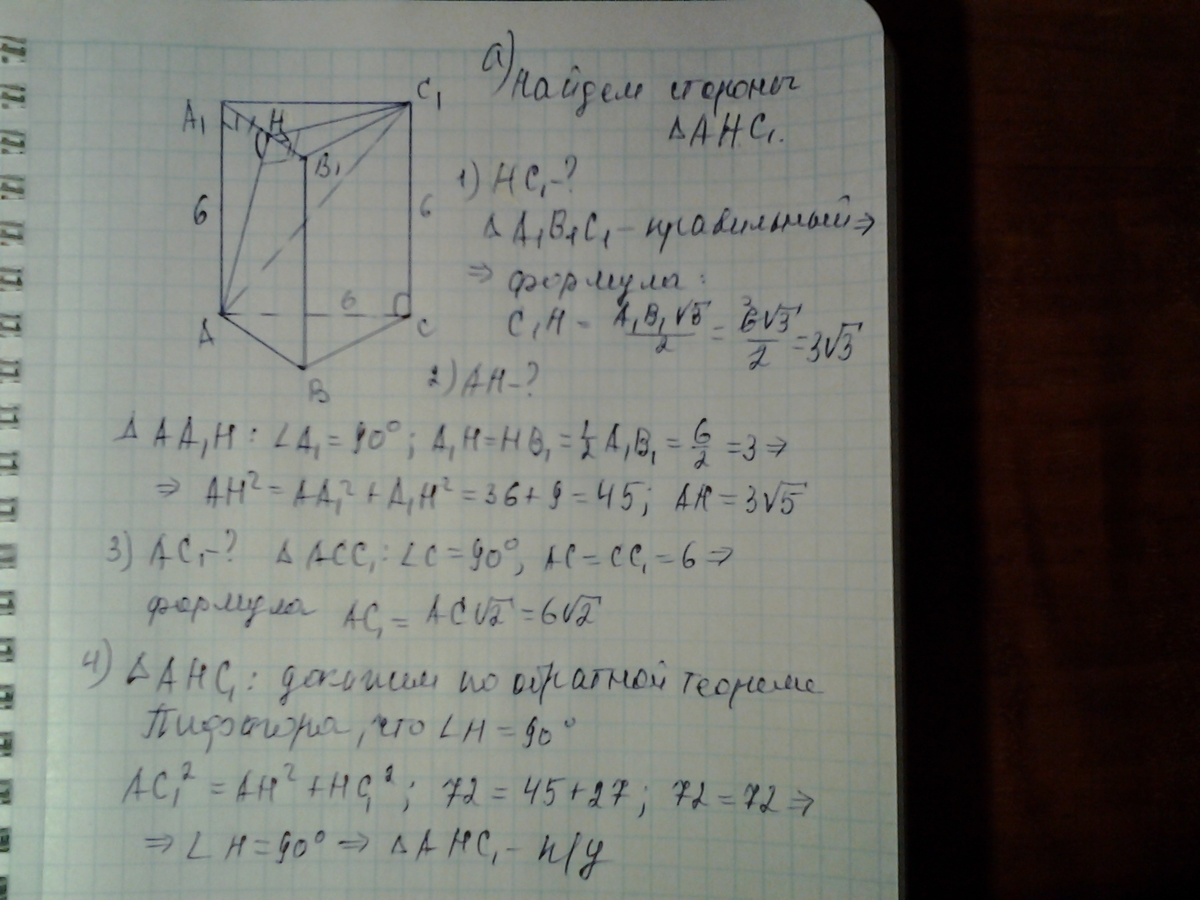 Применены: свойства правильного треугольника, теорема Пифагора, обратная теорема Пифагора, определение угла между плоскостями, определение тангенса